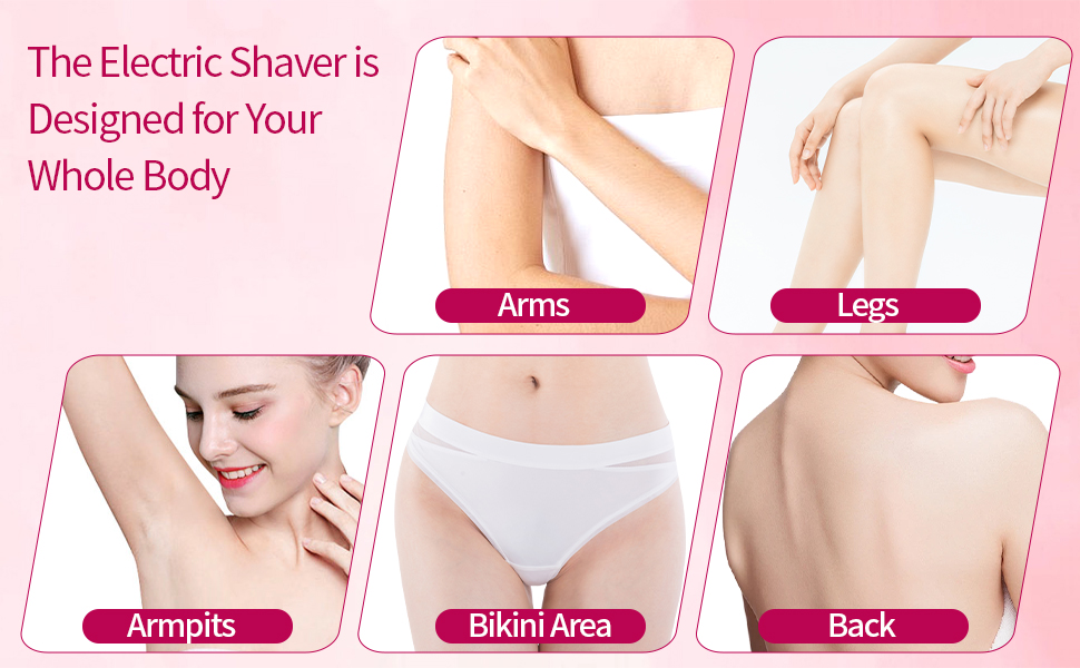 Diversified grooming options: Women's electric shaver for legs, arms, body, armpits, face, and bikini areas, leaving no residue behind.