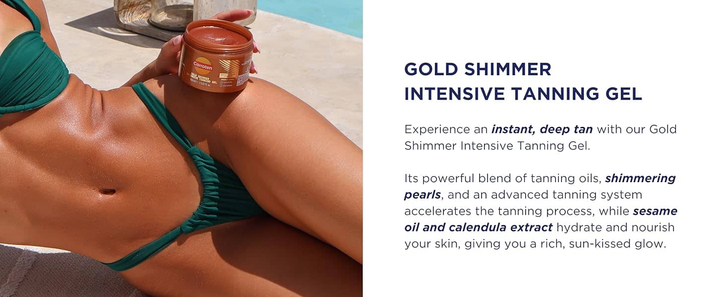 • Carroten Gold Shimmer Intensive Tanning Gel | Browning Tan Accelerator | Non-Greasy, Water-Resistant with Carrot and Coconut Oil | Vitamin A & E For Moisture & Hydration | Made in Greece | 5 Fl Oz