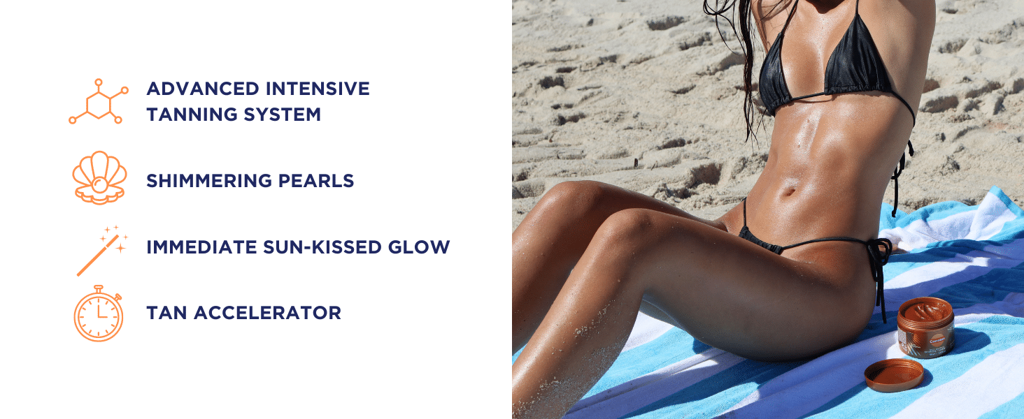 • Shimmering Pearls: Achieve an instant, even tan with a natural golden tone, enhanced by light-reflecting shimmering pearls. This radiant formula highlights your skin with a subtle sparkle, giving you that luminous, sun-kissed look.
