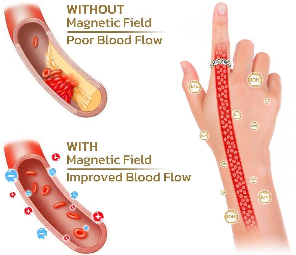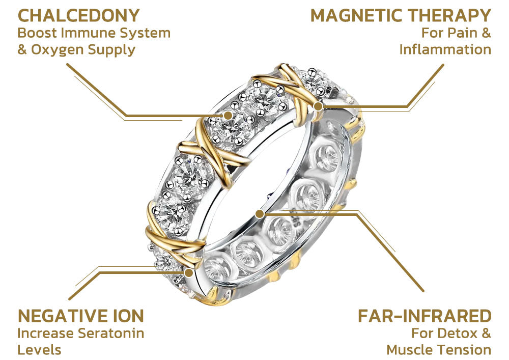 The majority of magnetic items either use magnets that only partially penetrate the magnetic field or use like poles that repel one another, leaving a dead zone between the magnets. Alternating North-South Polarity Orientation is used by Magnetology Moissanite Diamond Ring to maximize magnetic field flow and discharge electromagnetic charge, which helps to clear obstructions from the body and reestablish a normal energy flow.