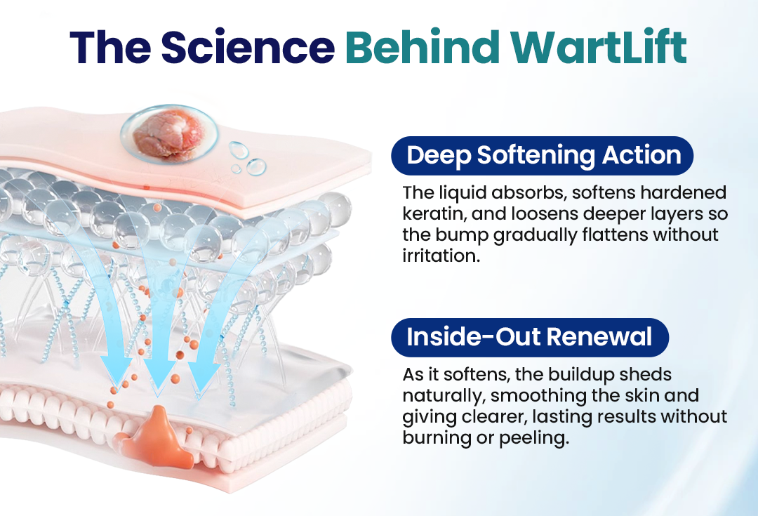 Once applied, the liquid begins to soften the hard keratin structure beneath the surface. As these deeper layers loosen, the raised bump or wart becomes less rigid and starts to flatten. Meanwhile, the surrounding skin remains comfortable because the formula acts mainly on the compacted tissue.