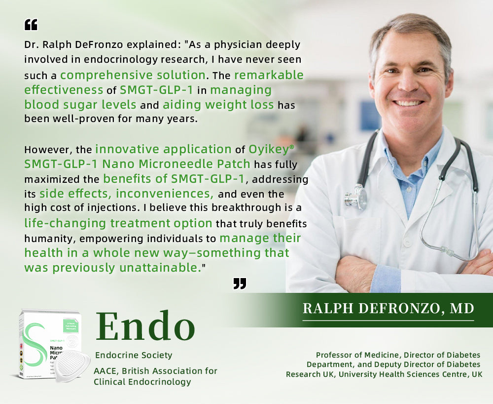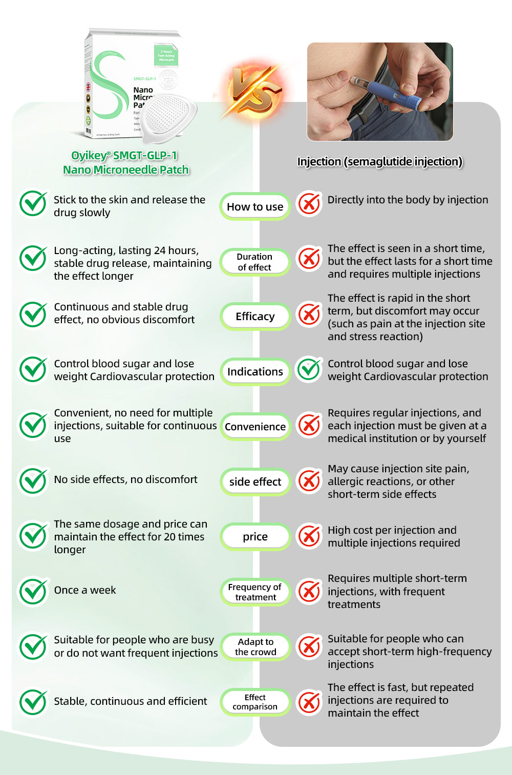 "I suffer from both obesity and diabetes, and I’ve been getting SMGT-GLP-1 treatment at the hospital. You might be wondering why I suddenly switched to using the Oyikey® Microneedle Patch. SMGT-GLP-1, also known as semaglutide, is definitely a great treatment. It works really fast—just a short time after injection, my appetite dropped, I lost weight quickly, and my blood sugar went down. But, as we all know, it’s tough to break old habits. On my scheduled injection days, I’d come up with all sorts of excuses to skip, which led to failed treatments. The cost, hunger, time conflicts, or even something as simple as it raining outside would keep me from going. But the Microneedle Patch is perfect for someone like me who struggles with inertia. I can use it easily at home, and the effects last, keeping my appetite in check. What’s even better is that it’s really affordable, and anyone can use SMGT-GLP-1 to help lose weight and keep their blood sugar in check!"