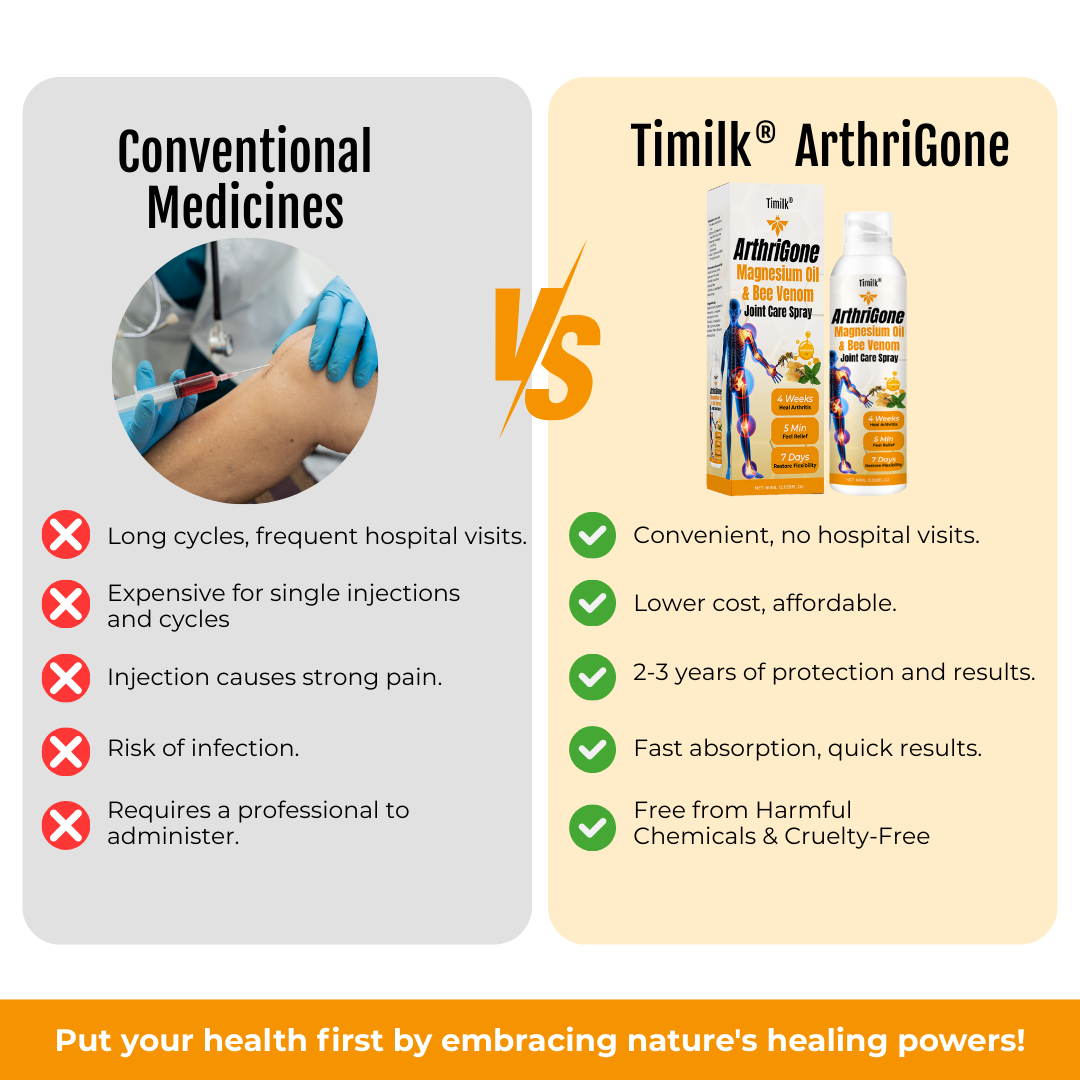 Experience true relief from joint pain, stiffness, and inflammation with Timilk® ArthriGone Magnesium Oil & Bee Venom Joint Care Spray—the natural solution trusted by experts and loved by thousands across the USA. Formulated with premium magnesium oil and potent bee venom, this fast-acting spray is your go-to remedy for chronic joint discomfort and inflammation. Whether you're dealing with arthritis, gout, or age-related stiffness, Timilk® ArthriGone delivers targeted support so you can move with ease and live without limits.