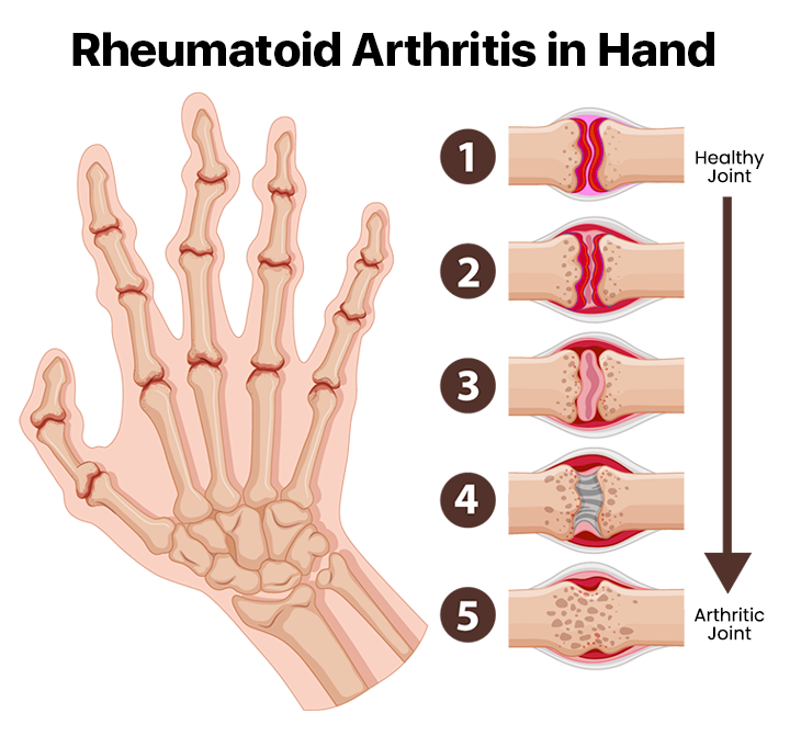 Rheumatoid Arthritis (RA) is a chronic disease where the immune system attacks the synovial lining, causing joint inflammation and damage. It typically results in pain, swelling, and stiffness in small joints like fingers, wrists, knees, and ankles, but can also affect larger joints.