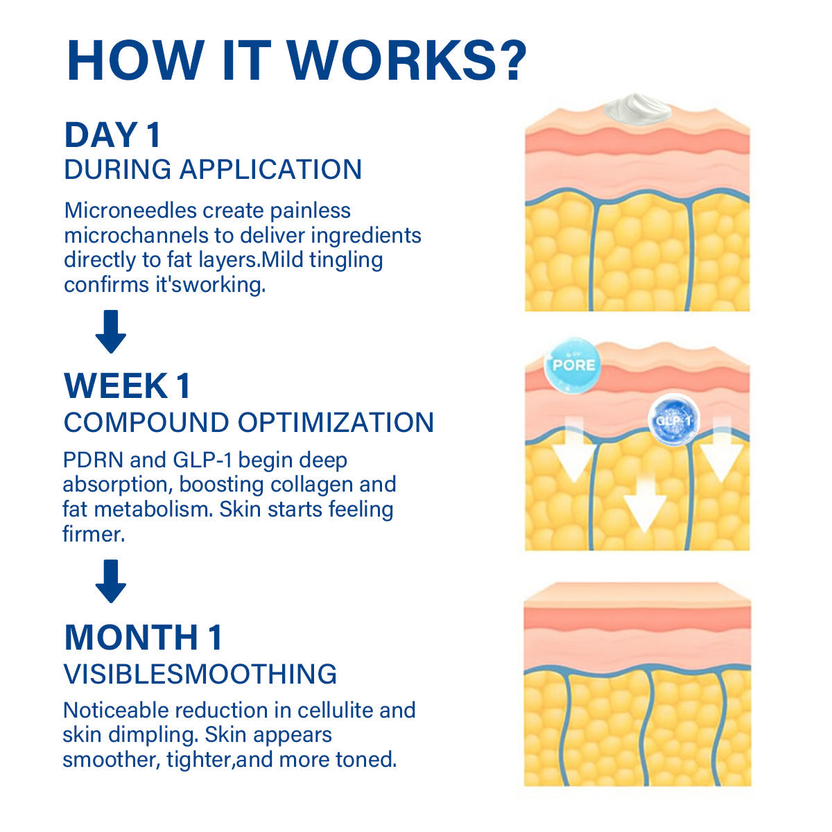 Fat-target connection (GLP-1) activates the localized fat metabolism and improves blood circulation in areas that are forced to cellulite for visible reduction in dents and smoothing the skin.