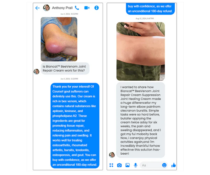 "For over five years, gout pain in my feet made life miserable. I spent thousands on treatments that didn’t work. Desperate for a solution, I tried Biancat® BeeVenom Joint Repair Cream. Within three weeks, I noticed relief, and after seven weeks, my pain was completely gone! This cream restored my freedom and quality of life."