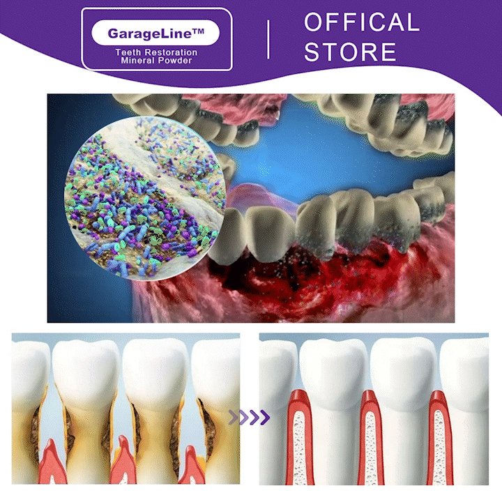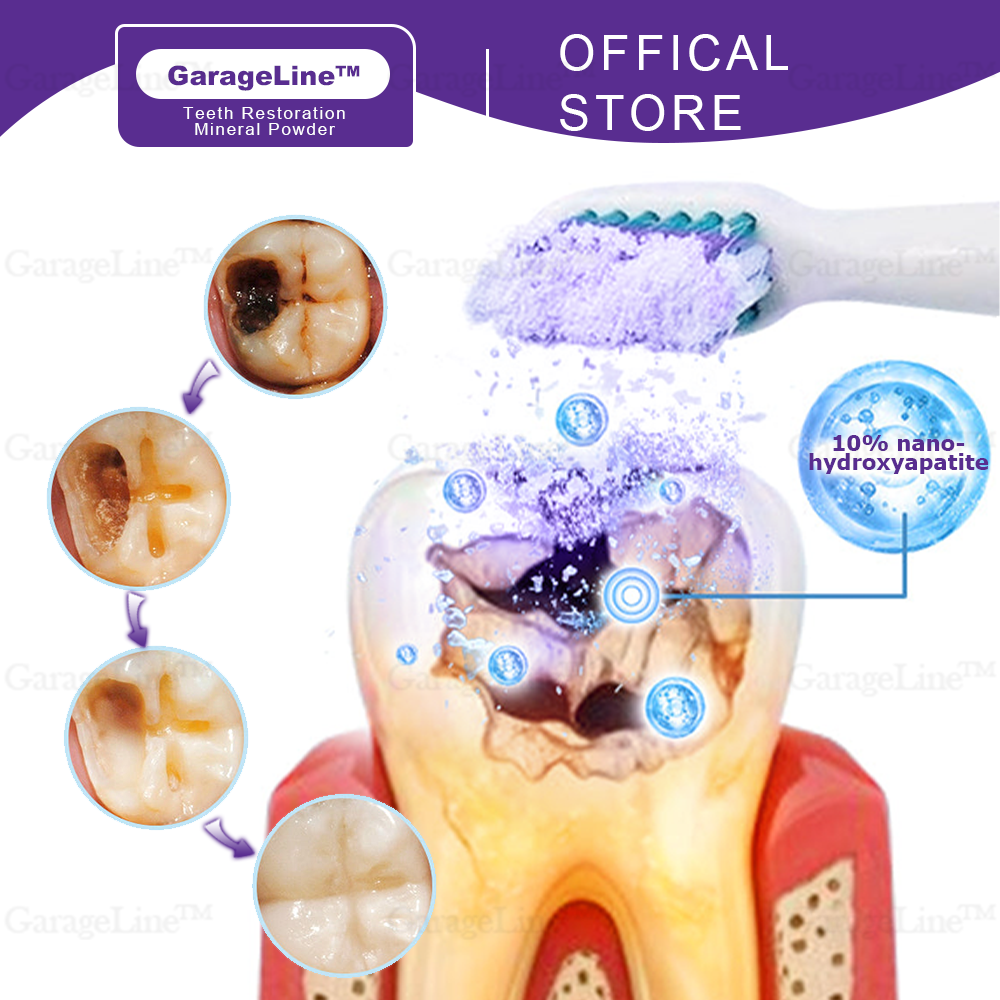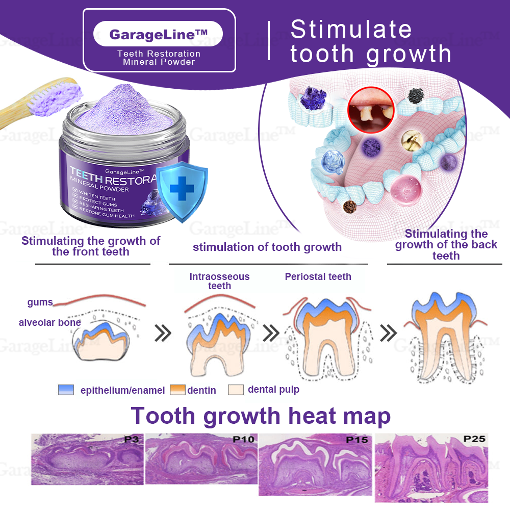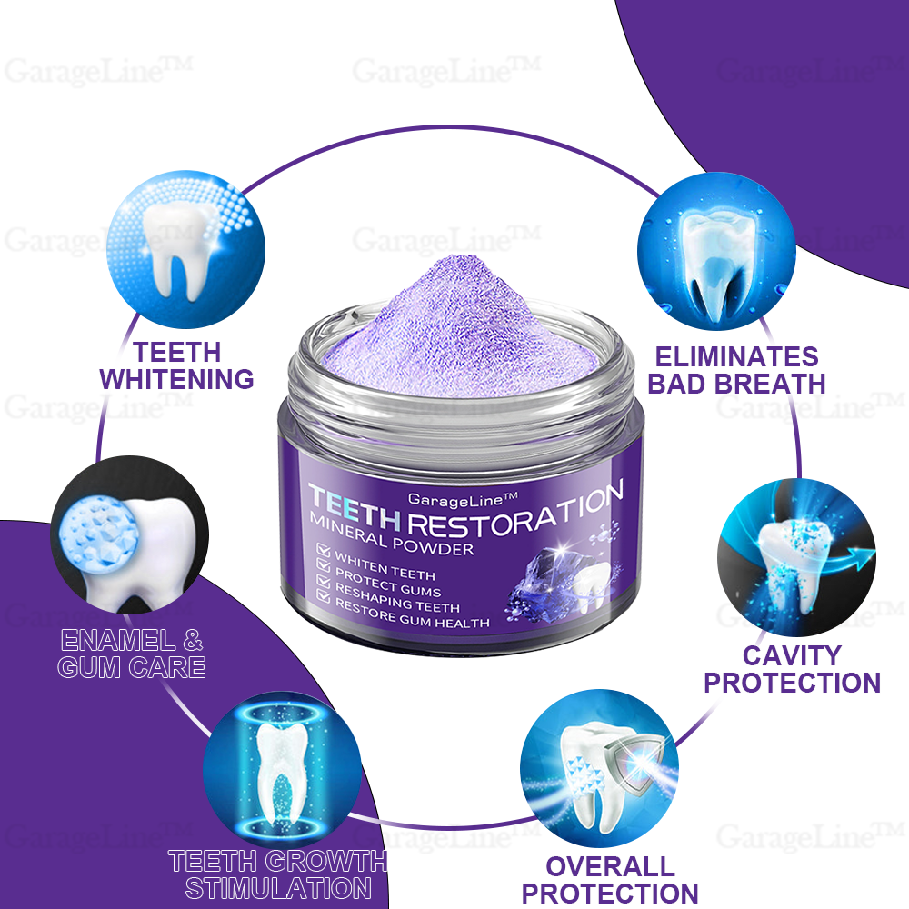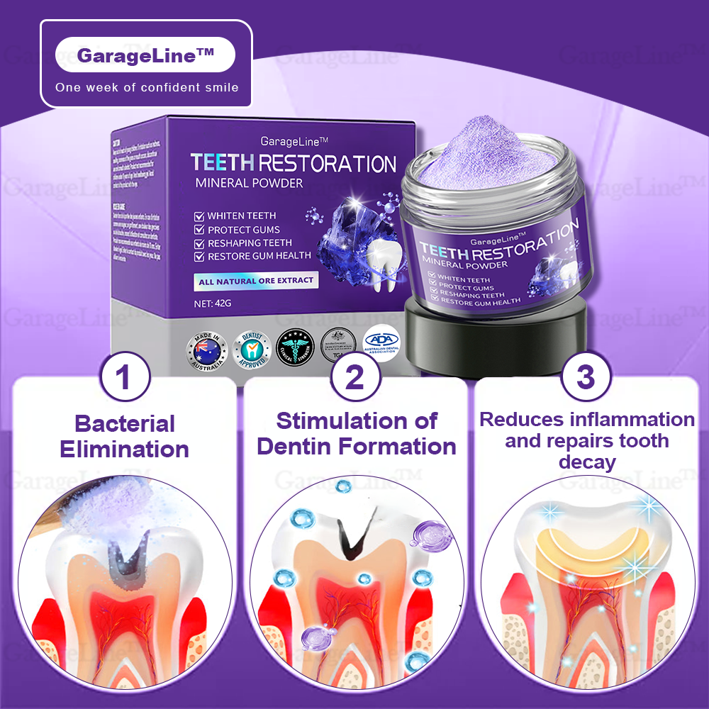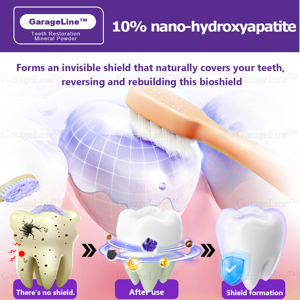 GarageLine™ Teeth Restoration Mineral Powder promotes the natural repair of teeth by stimulating the formation of dentin, helping to regenerate the tooth germ for a healthier, stronger smile.