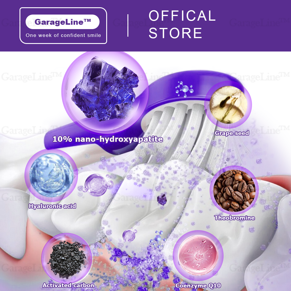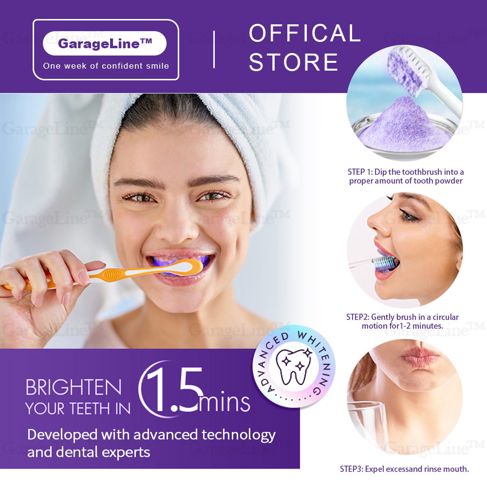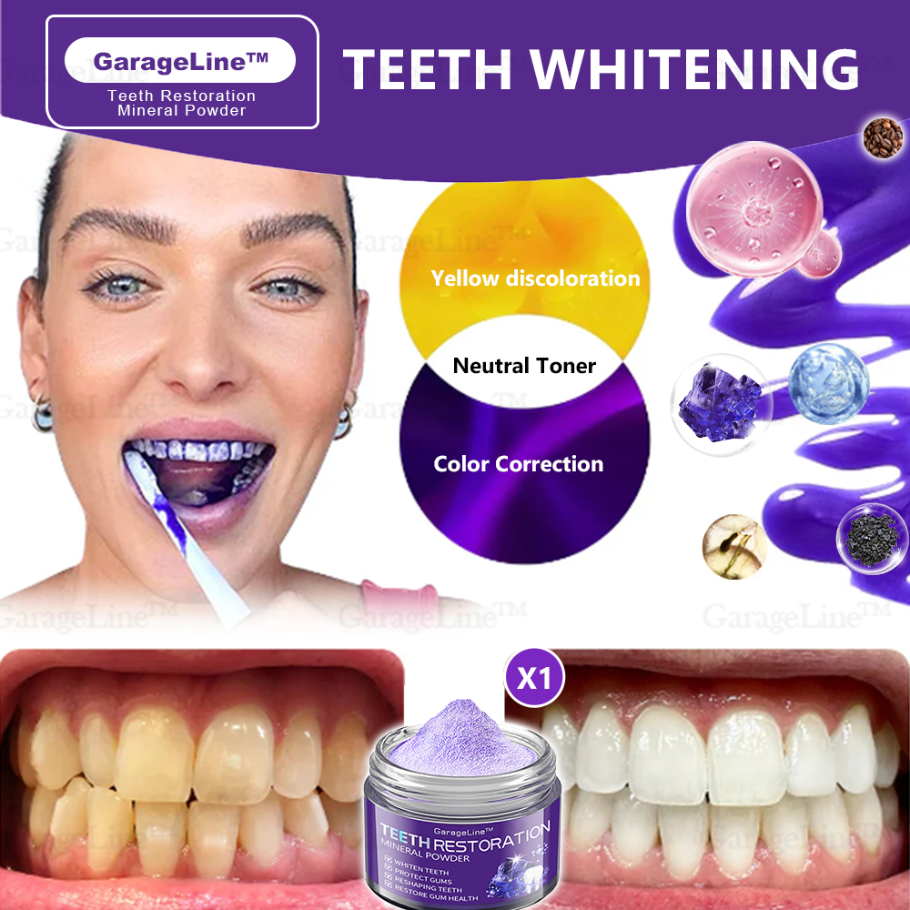 Experience noticeable whitening results in just one week with GarageLine™ Teeth Restoration Mineral Powder. Purple is the opposite and complementary color of yellow on the color wheel, so applying water-soluble purple dye to your teeth will counteract any yellow undertones. Plus, its vitamin C-rich formula removes plaque, tartar, and discoloration, restoring teeth to their natural whiteness.