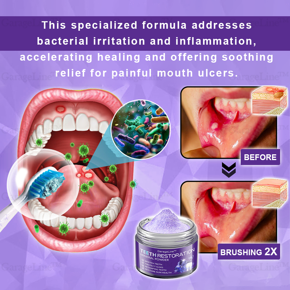 GarageLine™ Teeth Restoration Mineral Powder eliminates 99.99% of bacteria, resolves bad breath, removes plaque and tartar, treats gingivitis and periodontitis, relieves toothache, prevents and treats cavities, restores tooth enamel, stimulates reparative dentin formation, and supports the regeneration of lost teeth.