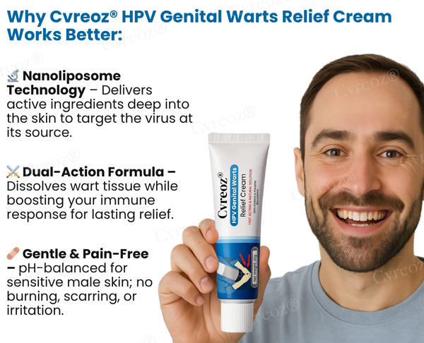 What truly sets Cvreoz® apart is its smart, pH-adaptive formula, engineered specifically for the delicate and sensitive nature of male genital skin. It works gently—without harsh chemicals or painful sensations—making it suitable for daily use, even in intimate areas. As it dissolves wart tissue, it simultaneously activates the skin's natural immune defenses, helping the body recognize and fight off the HPV virus more effectively. This dual-action approach is what makes Cvreoz® a standout solution: it not only removes existing warts quickly and painlessly, but it also addresses the root cause to help prevent future outbreaks. With consistent use, you gain more than just clear skin—you restore control over your health and peace of mind.