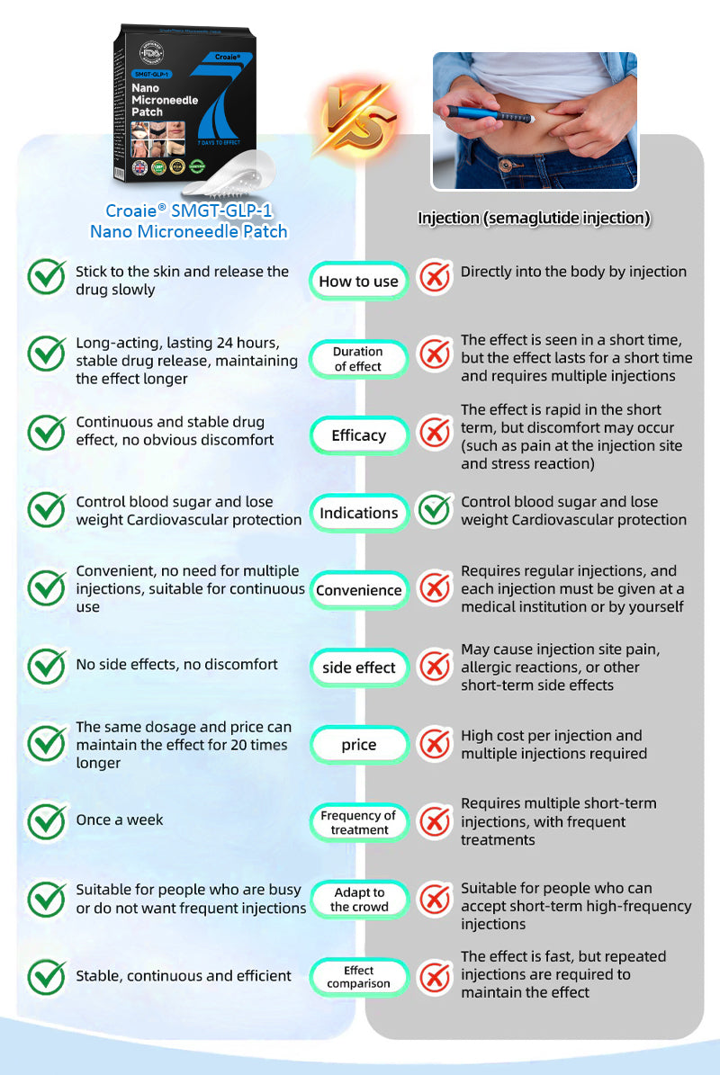 The CROAIE ® 𝐒𝐌𝐆𝐓-𝐆𝐋𝐏-𝟏 Nano Microneedle Patch offers a long-lasting, controlled release of the medication, ensuring stable effects over 24 hours without causing any discomfort. Based on the same dosage and price, it can maintain effects that last up to 20 times longer (similar to the difference between intravenous infusion and a single injection).