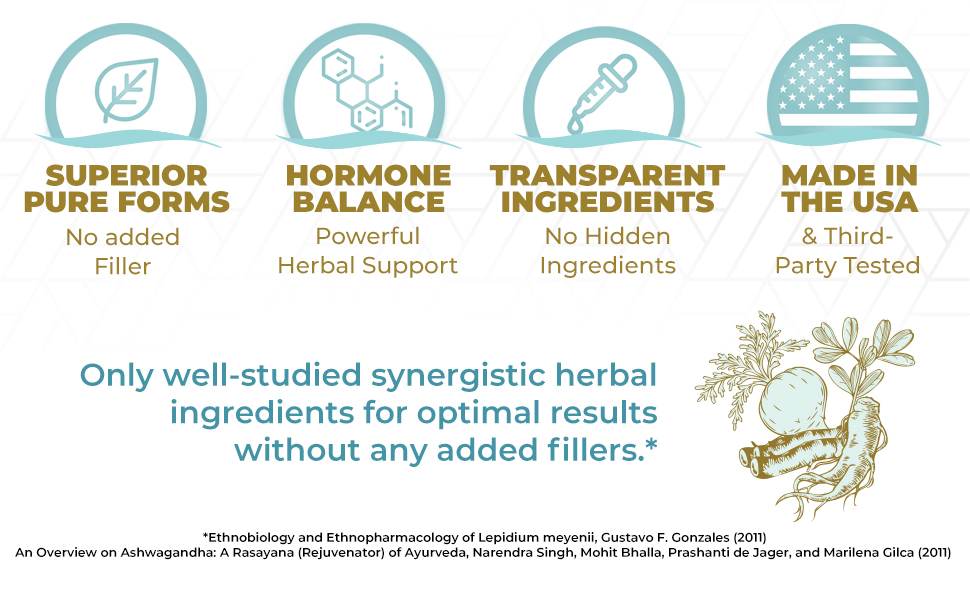 • HORMONE BALANCE: Black Maca Root, Ashwagandha, Fenugreek, and Panax Ginseng all help with hormonal balance and regulation of levels, including reproductive hormones and improving symptoms of imbalance.