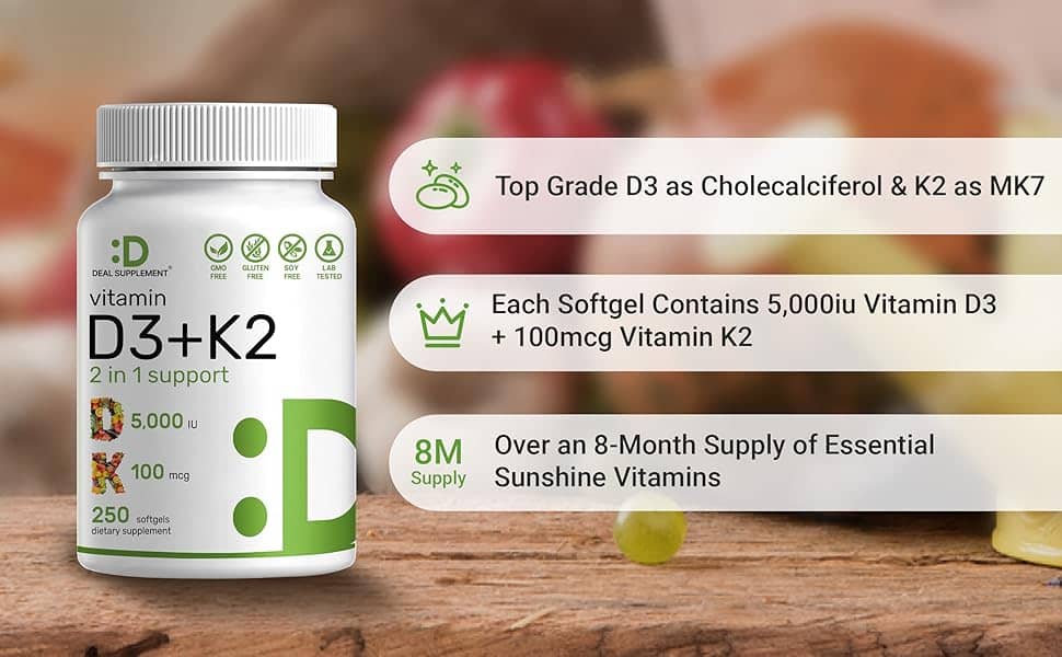 • The Best Partner – Vitamin D3 with K2 (D3 K2 Vitamin 5,000iu), to get proper calcium absorption vitamin D3 helps the body to absorb calcium and vitamin K2 will direct it into bones, the perfect pair to fight vitamin D deficiency and maximize overall benefits.