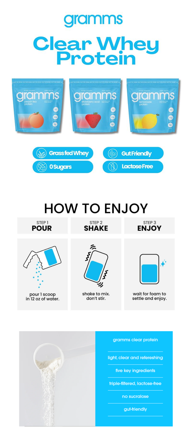 • Clean, Simple Ingredients: Made with simple, non-gmo ingredients, our whey isolate protein powder is triple-filtered to remove carbs, fat, and lactose. With zero sugar, no artificial additives, and no fillers, gramms is a clear whey isolate protein option that delivers pure, high-quality protein without unnecessary extras.
