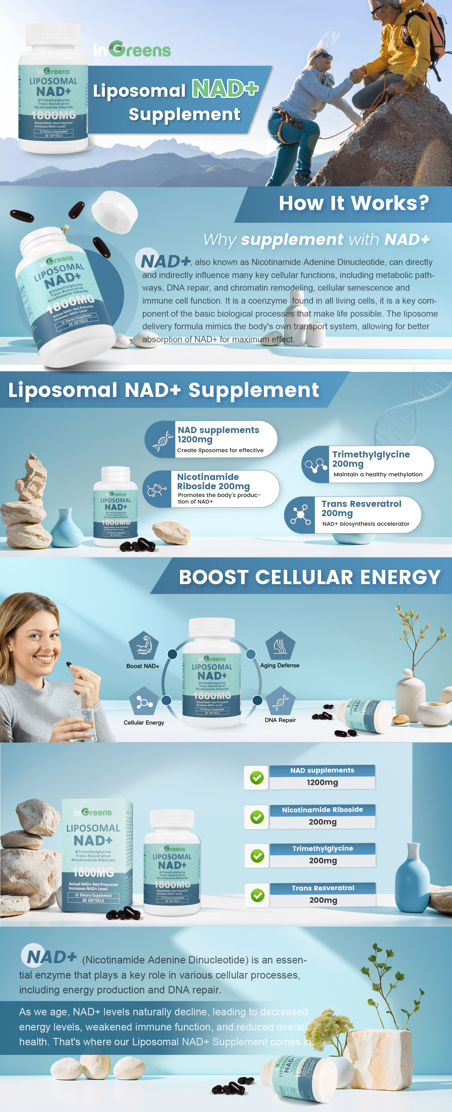 - Boost Cellular Energy: Our Liposomal NAD+ supplement contains 1800mg of powerful ingredients including NAD supplements 1000mg and Nicotinamide Riboside 200mg to enhance your body's cellular energy production and helps protect against oxidative stress and DNA damage.