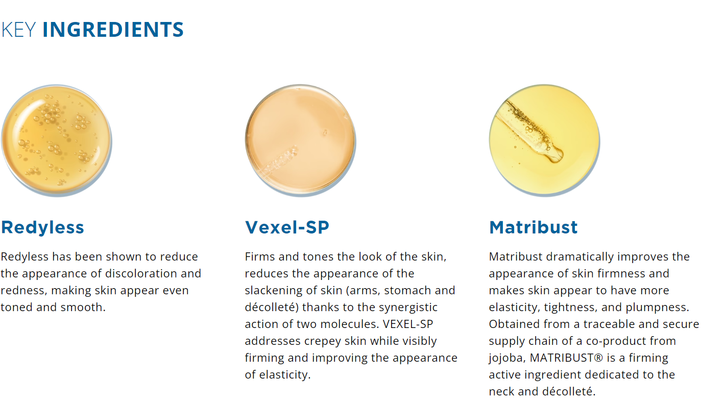 Multiple clinically proven ingredients work in harmony to diminish the appearance of lines, wrinkles, and redness for a smoother, more even neck and chest area.