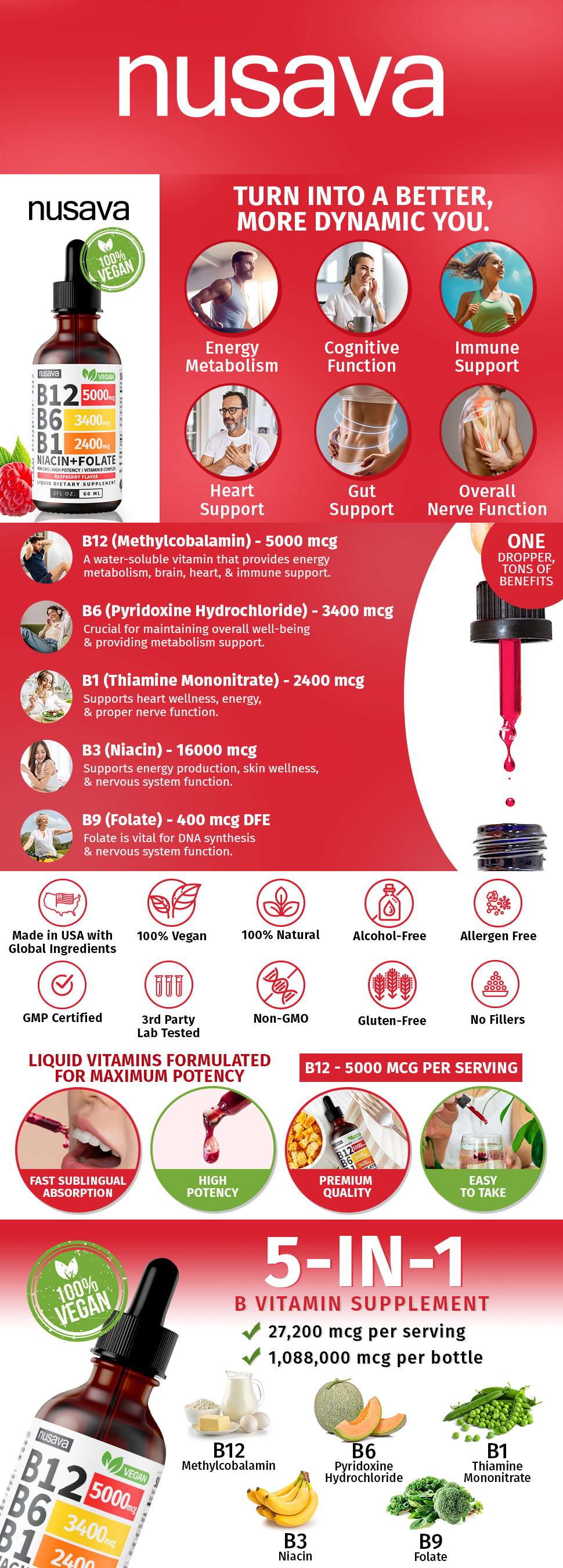 - B12 Drops Formulated for Maximum Potency - Our Liquid Vitamin B12 Drops contain Vit B12 5000mcg, B6, B1, Niacin, and Folic Acid, supporting overall body functions with 100% or more Daily Value.