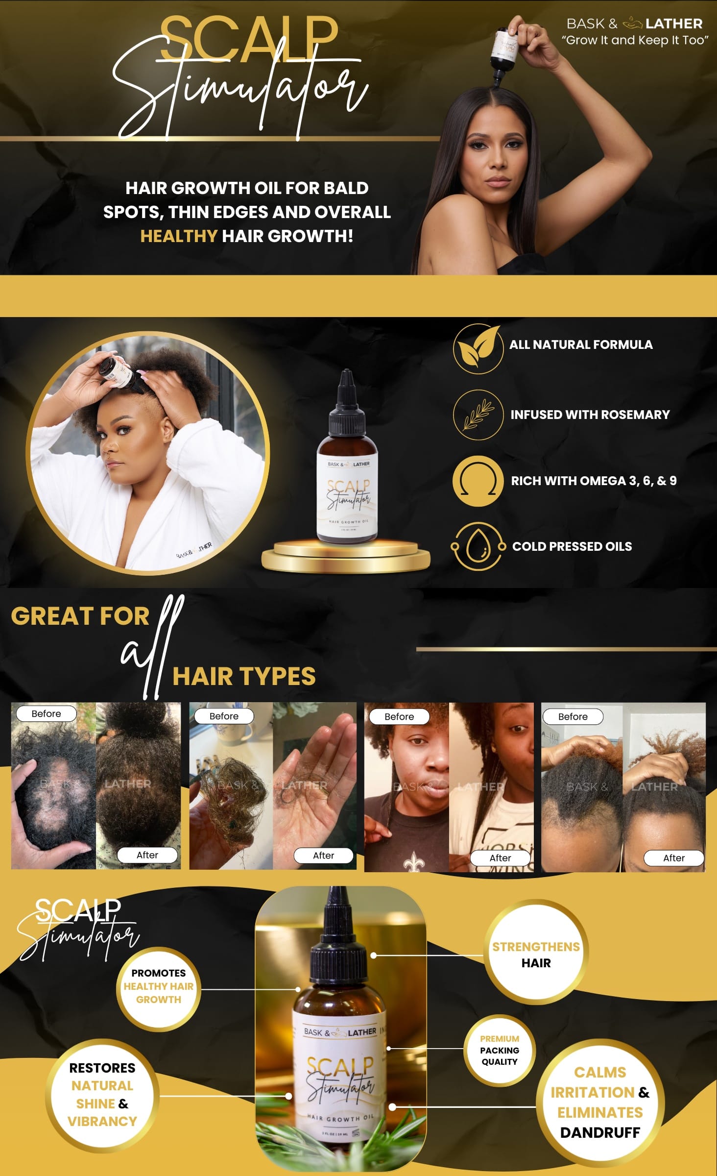 - HAIR CARE OIL: Elevate your routine with Bask and Lather Hair Growth Oil, designed to help with hair thickness by activating and expanding the cells within your hair follicles. This stimulation encourages the production of thicker hair. Pair it with a scalp massager to enhance stimulation beneath the skin, helping to promote new hair growth.