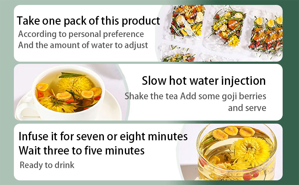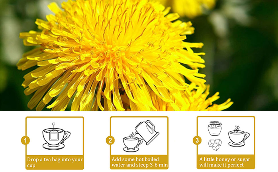 • Take a small bag of dandelion tea and put it in the cup pour 95-100°c into the cup. after five minutes, you can drink it. each bag can be brewed 5-6 times.