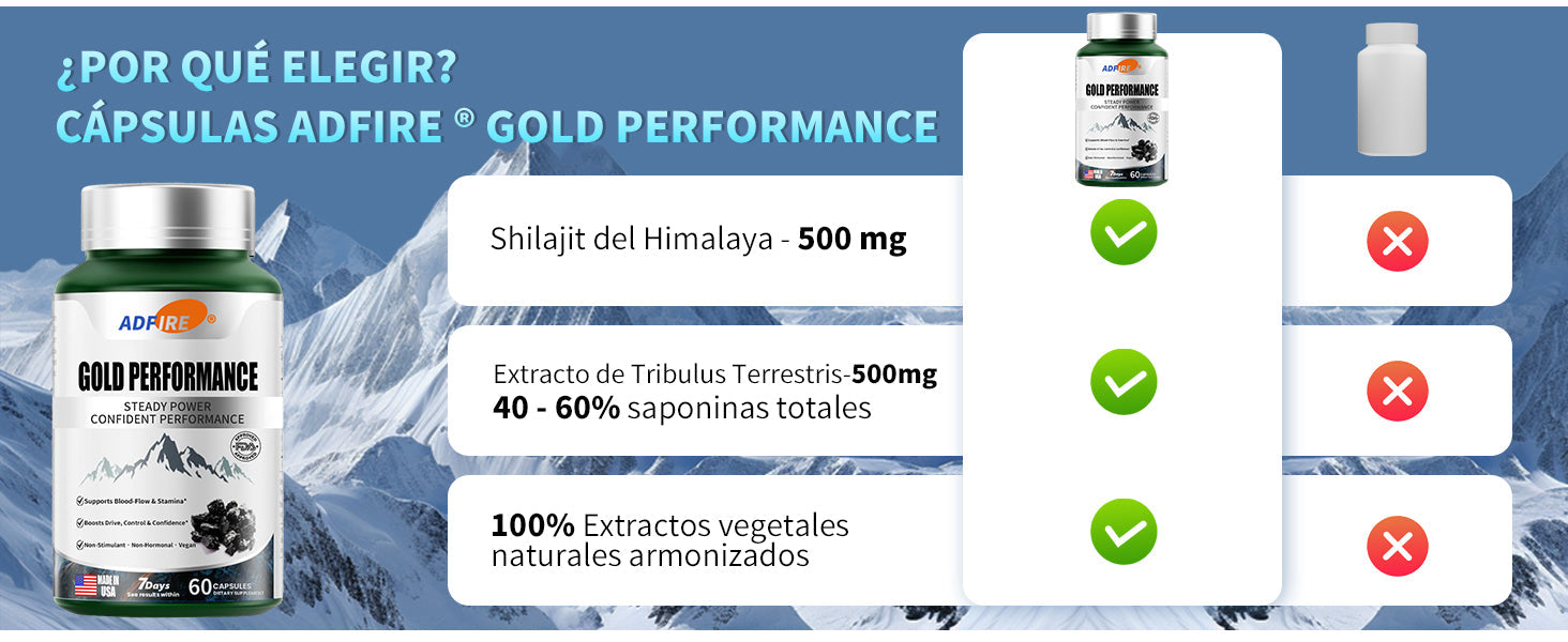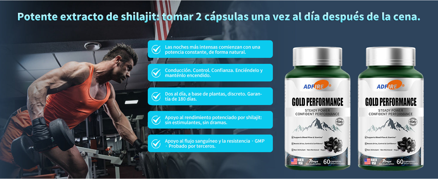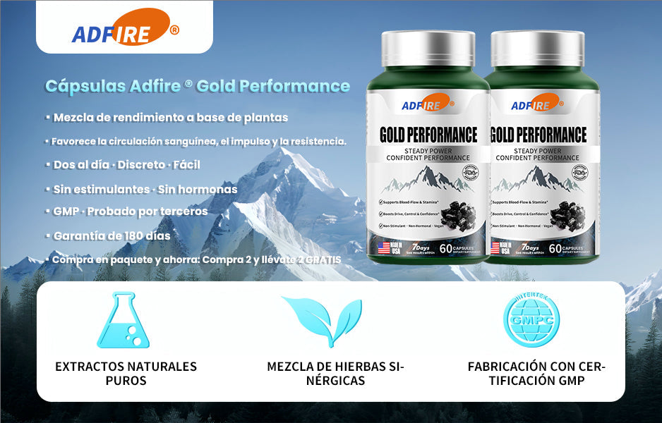 Libere su poder con las cápsulas de rendimiento Adfire® Gold: la forma natural de sentirse más grande, durar más y desempeñarse mejor.